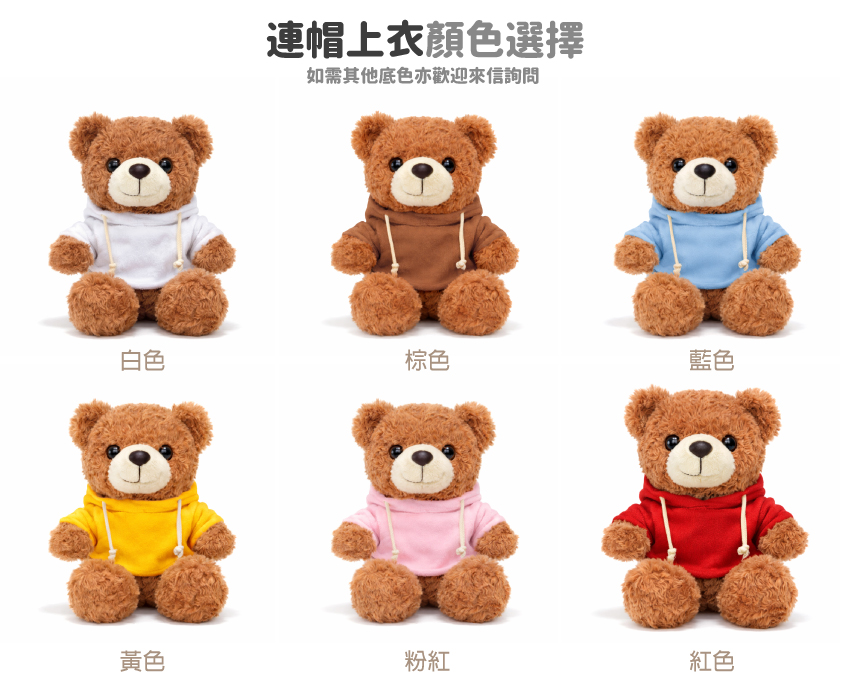 連帽上衣款(帽T)是客製LOGO熊娃娃中最具年輕感與潮流感的熱門選擇,適合企業活動、品牌快閃店、展覽贈品與IP周邊商品製作