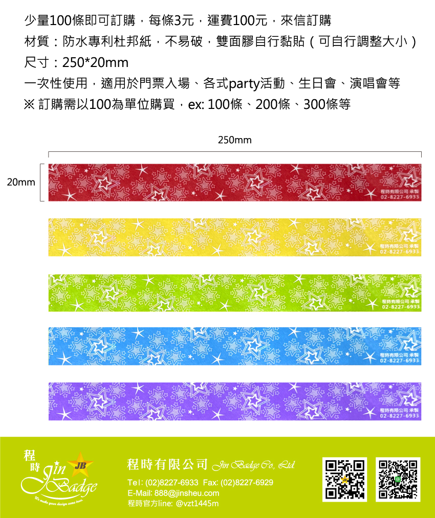 2025 最新活動手環,程時獨家設計,現成款馬上訂購: 專屬活動一次手環,歡迎訂製個人門票小物,2025年活動門票手環、生日活動門票、一次性手環 現成款快速出貨,匯款後1~2個工作天內出貨,五種顏色可選:紅、黃、綠、藍、紫 歡迎選購程時公司推出現成款超級星一次性手環、一次性手腕帶 一次性手環推薦耐用杜邦紙材質,防水專利材質,水上活動、生日party活動、私人慶生會等 歡迎媒體公關、行銷活動公司等少量訂購一次性手環入場帶,可當門票辨識身份用。 杜邦紙背膠式手環(含雙面膠)一次性使用,防水不易破 馬上來信訂購:Email住址會使用灌水程式保護機制。你需要啟動Javascript才能觀看它 或加LINE:@vzt1445m