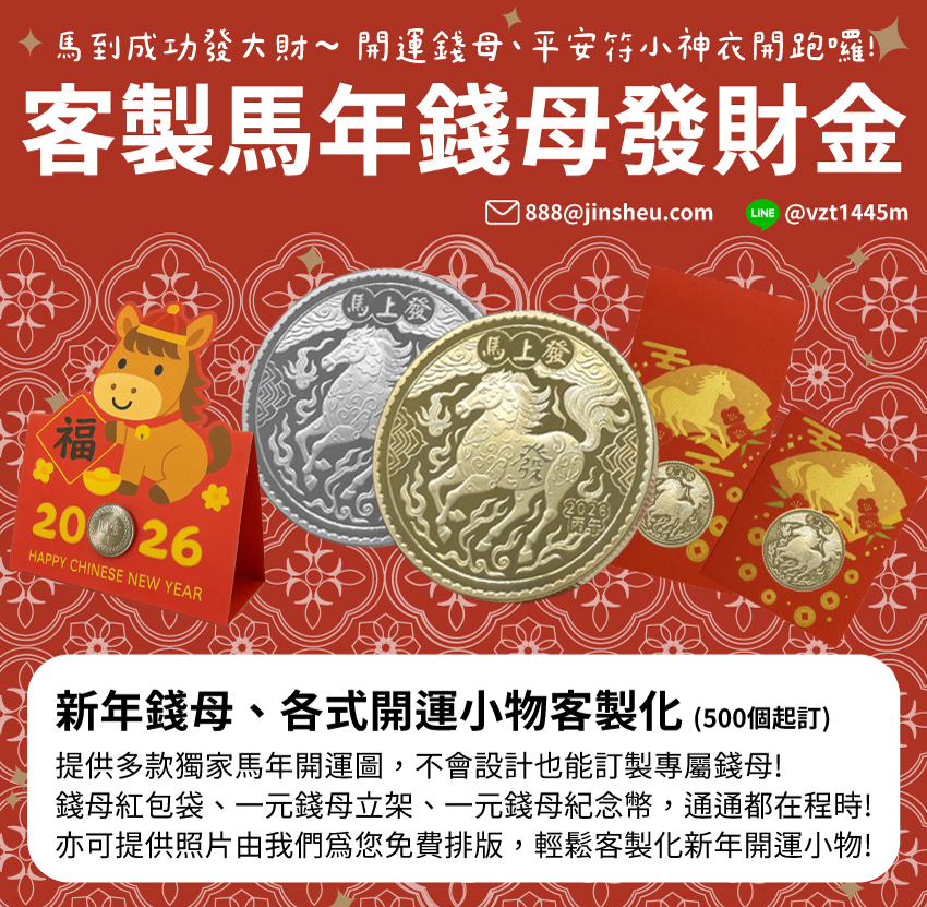 不會設計也沒關係!提供照片或圖案,我們幫您免費排版 2026馬年生肖錢母紀念幣客製、平安符香火袋製作、丙午馬年金幣訂做早鳥優惠中 馬年紀念幣公版圖案可選,雙面訂製也OK,來圖詢問客製錢母製作細節 免運費、免製圖費,來圖照片即刻訂製,工廠直營一條龍客製錢母發財金幣 客製開運錢母金幣、平安符香火袋,客製金馬年發財金紀念幣找專業程時最安心 歡迎來信:Email住址會使用灌水程式保護機制。你需要啟動Javascript才能觀看它 或加 LINE:@vzt1445m